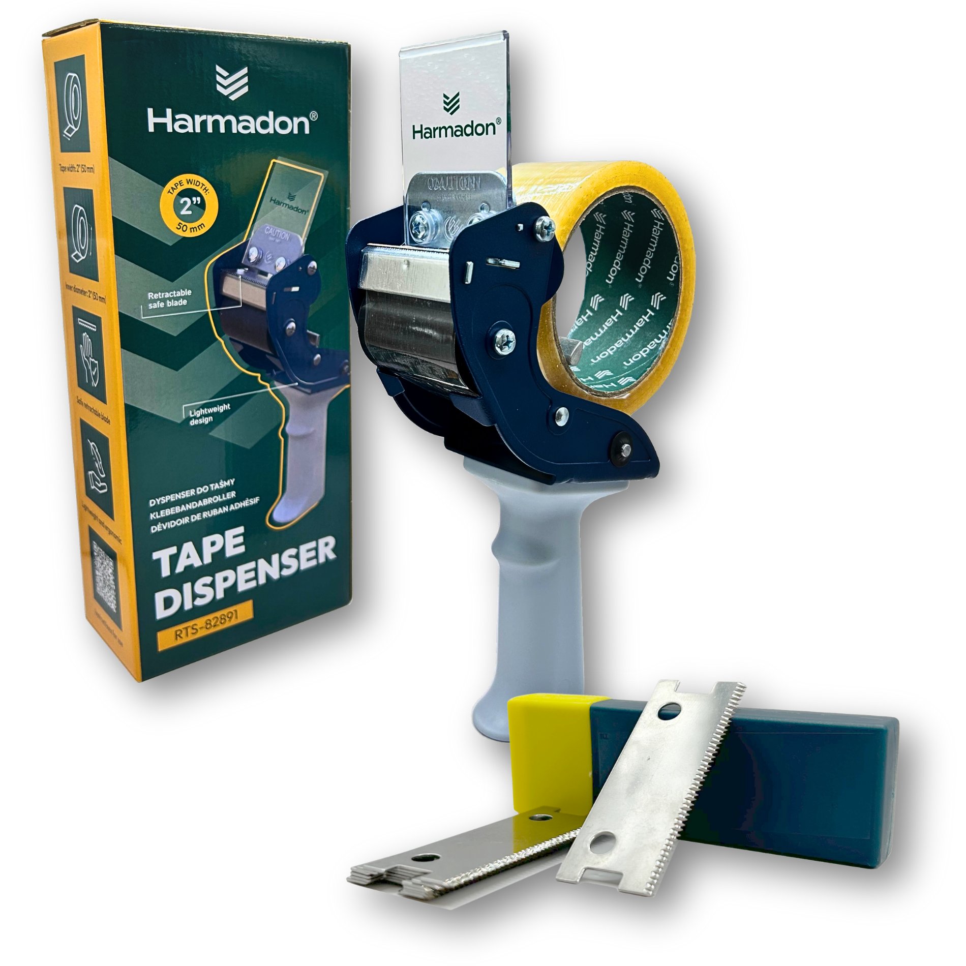 Profesjonalny zestaw do pakowania i klejenia składający się z wytrzymałego dyspensera Harmadon RTS-82891 oraz wymienne ostrze. To niezawodne rozwiązanie do pracy w magazynach, biurach, sklepach i w domowym użytku.